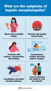 When the liver struggles to detoxify the blood effectively, toxins may affect brain function, leading to: